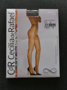 Als Besonderheit sticht hervor, dass diese Strumpfhose keinen Bund hat, also jenen oberen Abschluss, der sie normalerweise stramm auf der Hüfte sitzen lässt. Verstärkt ist allein der Streifen um die Wäscheflachnaht; außerdem verfügt die Cecilia de Rafael über einen Baumwollzwickel.