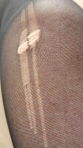Wie auf dem Foto zu erkennen ist, hat sich das Loch zwar bisher nur ansatzweise zu einer Laufmasche entwickelt. Bei herkömmlichen Strumpfhosen sähe dies womöglich schon ganz anders aus. Aber was nicht ist, kann ja noch werden.